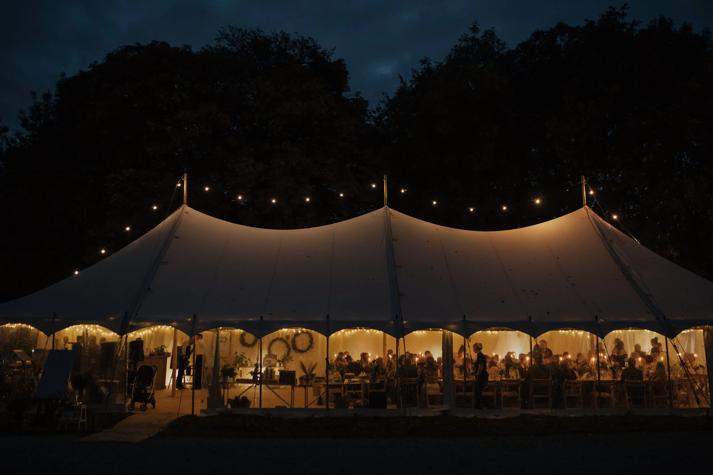 Delicate fairy lights are strung around the perimeter of the marquee, softening the edges of the canvas as daylight fades. The sailcloth gently reflects the warm light, helping the space transition naturally from daytime dining to evening reception.