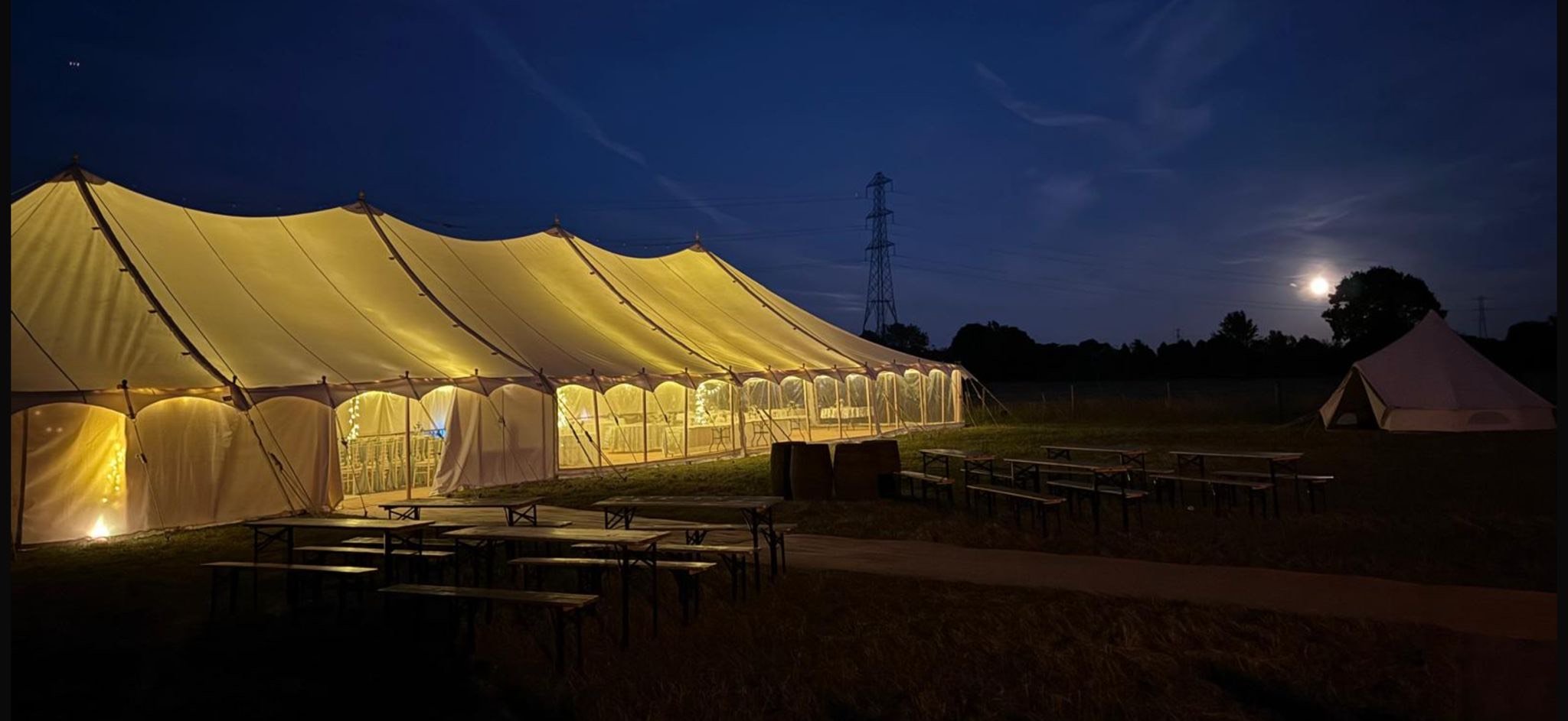 In the evening, an unlined sailcloth marquee creates a warm glow when lit from within. Festoon lighting, pendants and pole-mounted uplighters tend to work particularly well.