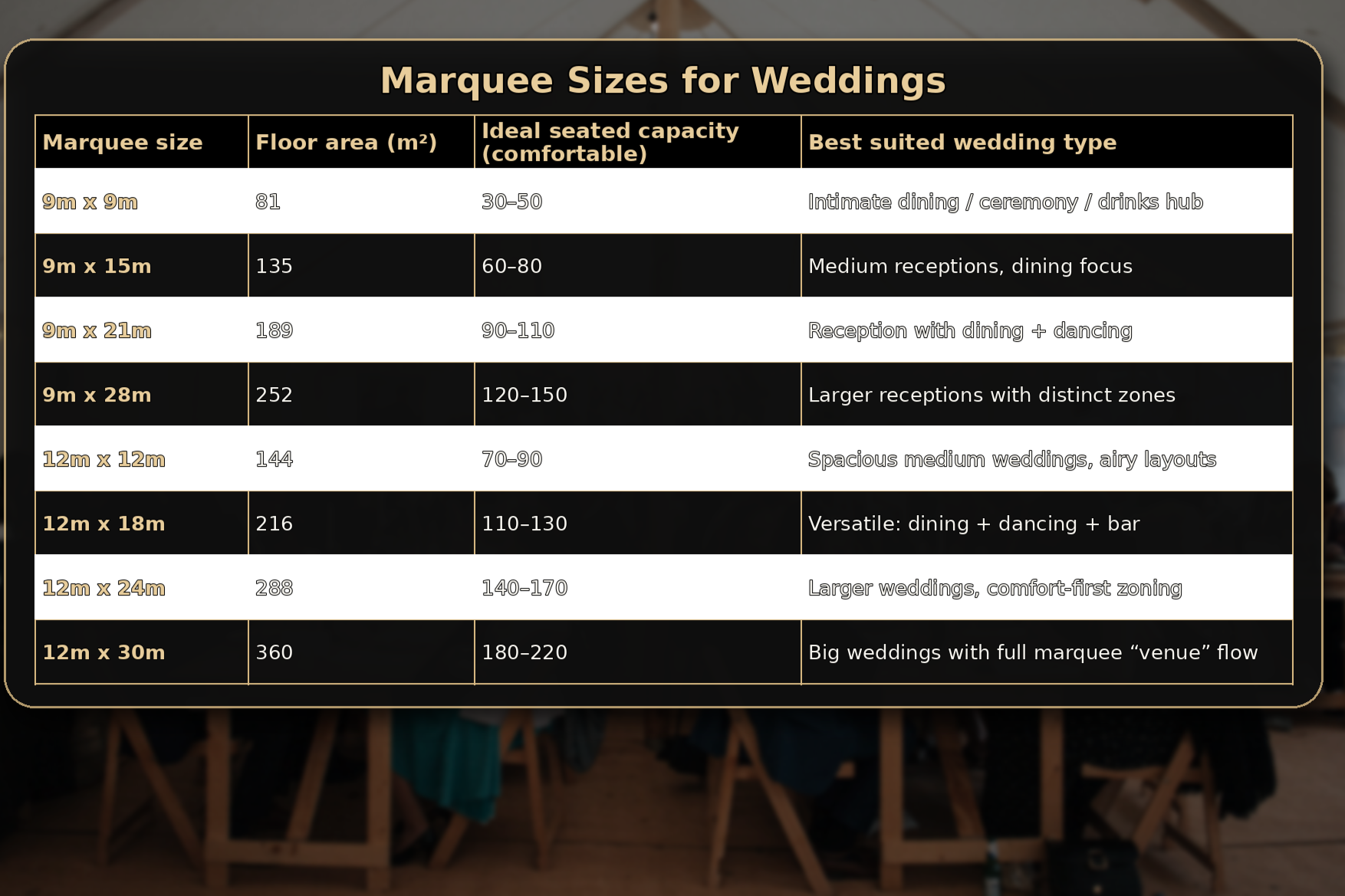 Note on capacities: Traditional marquee suppliers often publish high “seated” numbers using tight layouts (for example, seating per 3m x 3m bay can vary widely depending on table size and spacing). In this guide, we’re deliberately aiming for spacious and comfortable.